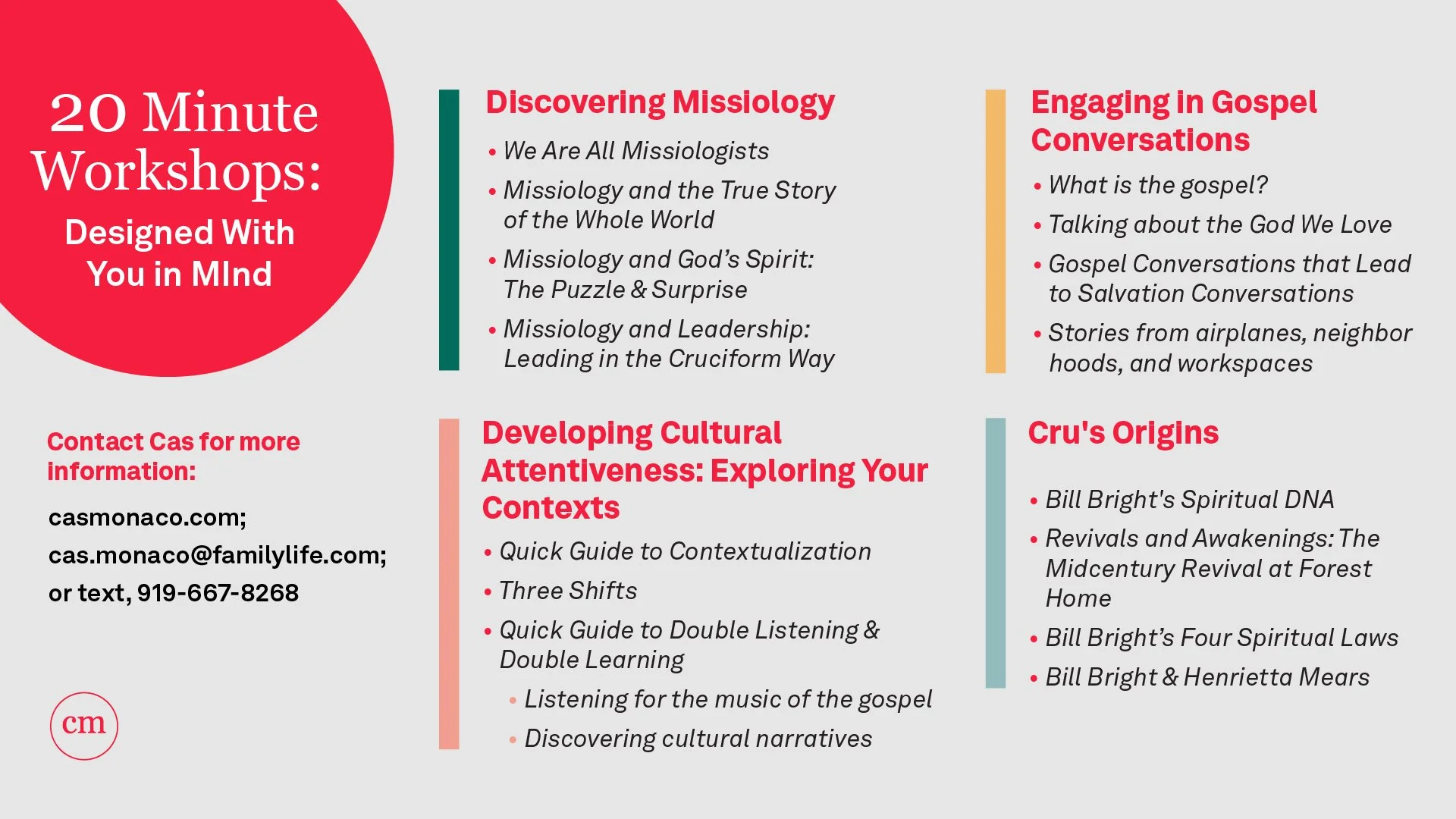 Twenty Minute Workshops Designed with You in Mind: These twenty minute workshops cover a variety of topics related to meaningful gospel conversations and are well-suited for small groups, staff teams, or ministry leaders. I’m available to join your group in person or online. Interested? Email me at Cas.Monaco@familylife.com